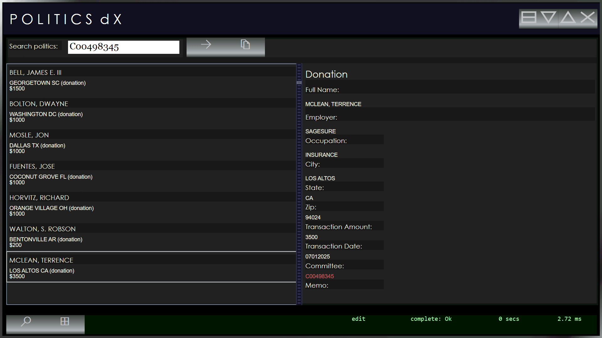 PoliticsDx lets you search the entire US election database, locally on your machine. You can search for candidates and donors and committees.